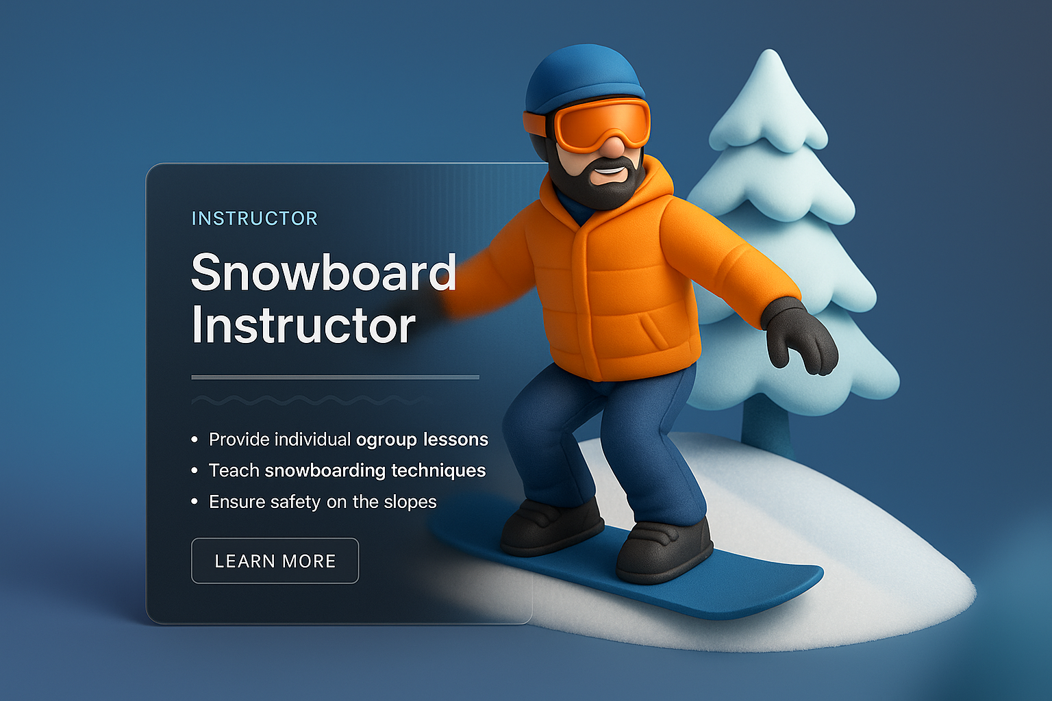 /Collection: /by davooda/Type: PNG/A dynamic 3D illustration featuring a snowboard instructor on the slopes, wearing an orange jacket and goggles. The design includes a stylish information panel with key points about lessons and safety.