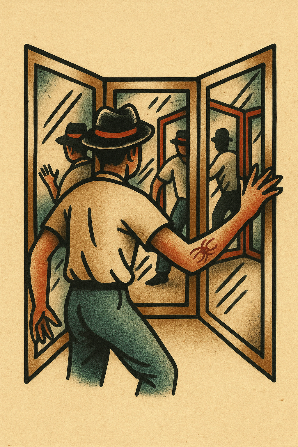 An illustration of a man with a tattoo, exploring a room filled with mirrors. He appears to be searching for an exit, reflecting themes of self-discovery. The background is a subtle beige.