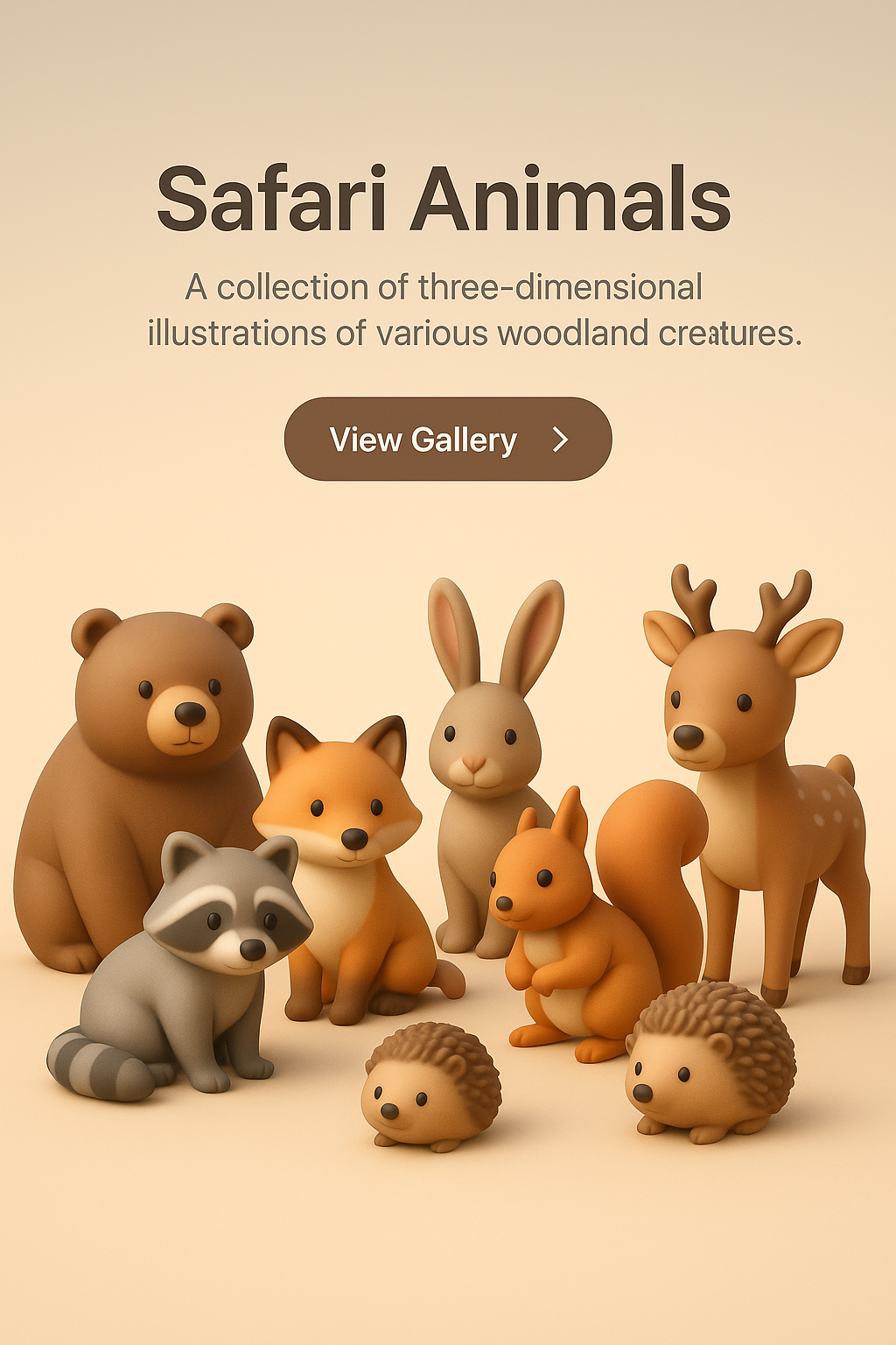 A charming 3D illustration featuring various woodland animals including a bear, raccoon, fox, hare, squirrel, hedgehog, and deer, set against a soft gradient background.