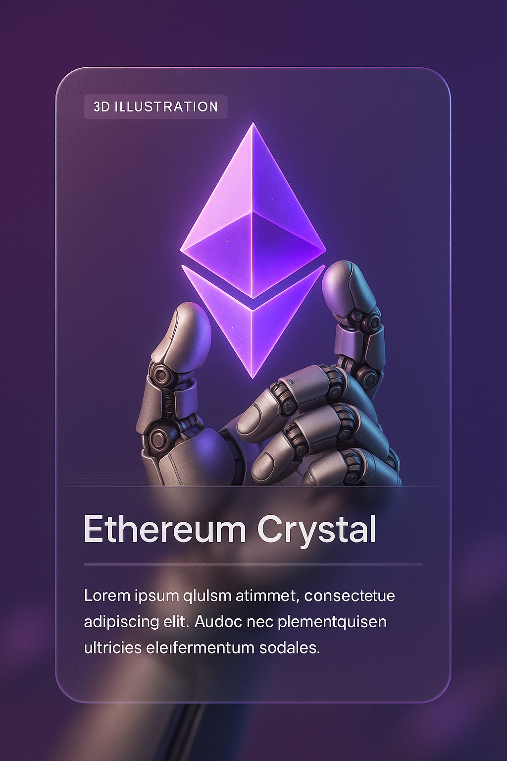 /Collection: /by davooda/Type: PNG/A detailed 3D illustration featuring a robotic hand grasping a luminous Ethereum crystal, set against a smooth gradient background. The design includes a stylish text block with a label.