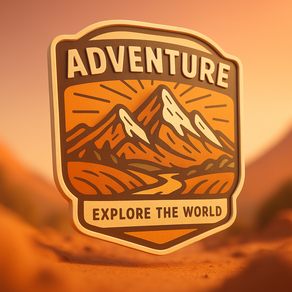 /Collection: /by davooda/Type: PNG/A vibrant and stylized badge design featuring mountains and a river, perfect for outdoor and adventure-themed branding or merchandise. The warm color palette enhances the exploratory theme.