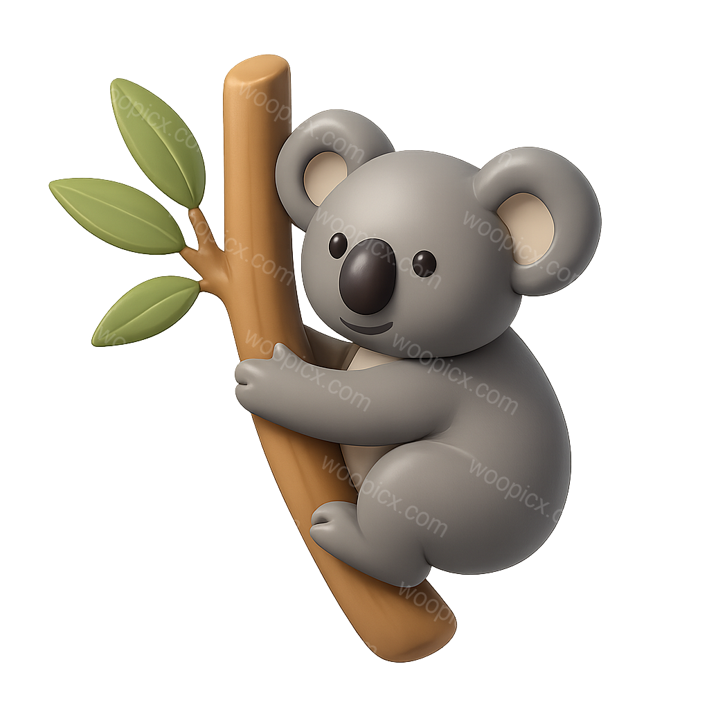 /Premium/Collection: /by davooda/Type: PNG/A stylized 3D icon of a koala clinging to a eucalyptus tree branch, featuring a soft, volumetric design with a transparent background. The koala is depicted in a three-quarter view.