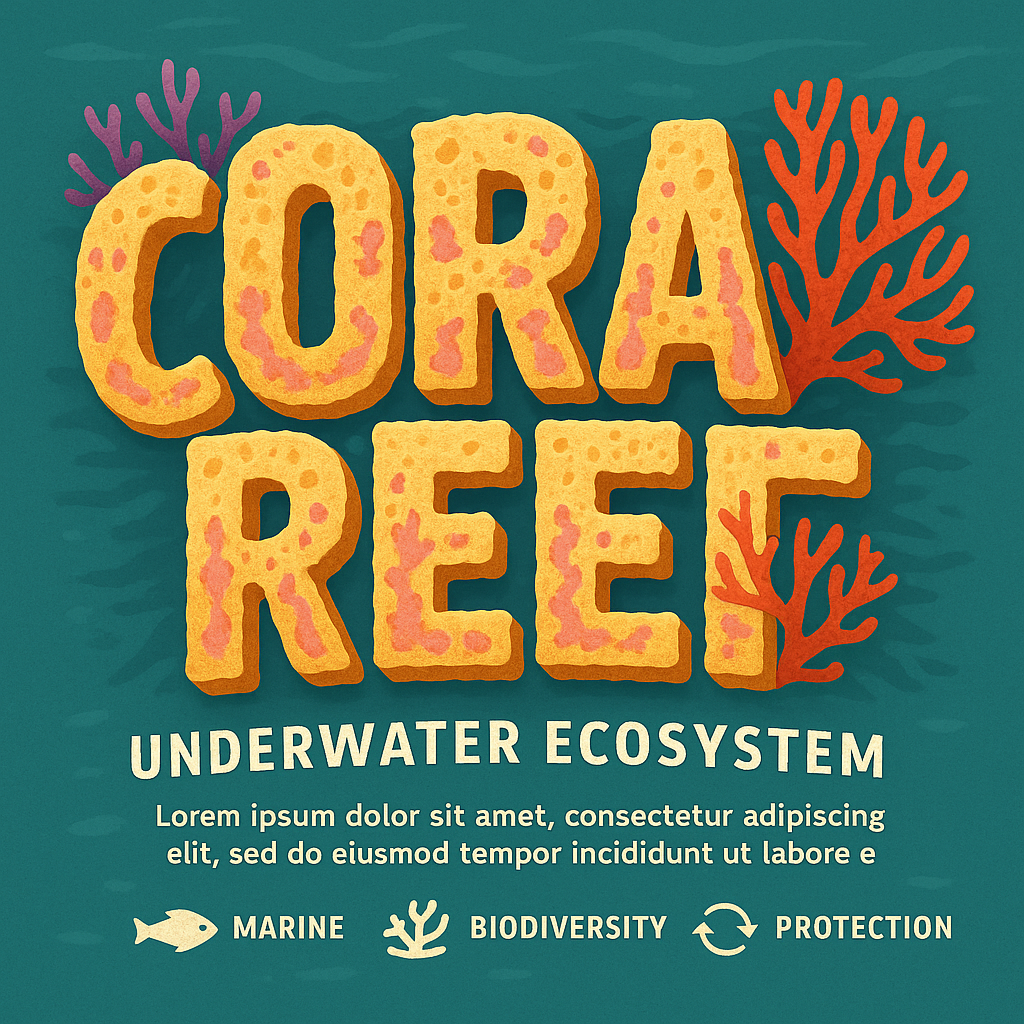 /Collection: /by davooda/Type: PNG/Vibrant graphic illustrating the coral reef ecosystem, featuring playful typography and coral motifs, suitable for educational or environmental awareness campaigns.