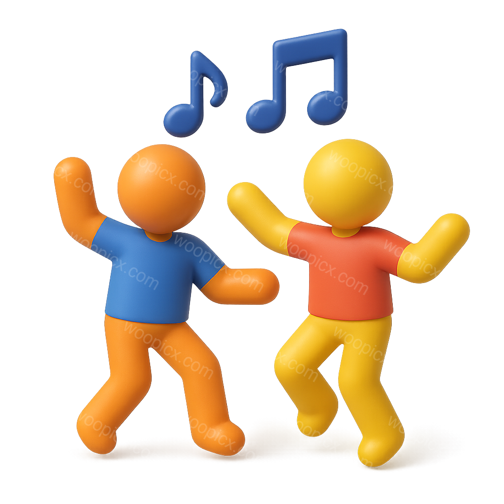 /Premium/Collection: /by davooda/Type: PNG/A vibrant 3D illustration featuring two stylized figures dancing joyfully. One figure is orange with a blue shirt, and the other is yellow with a red shirt. Above them are musical notes, enhancing the lively atmosphere.
