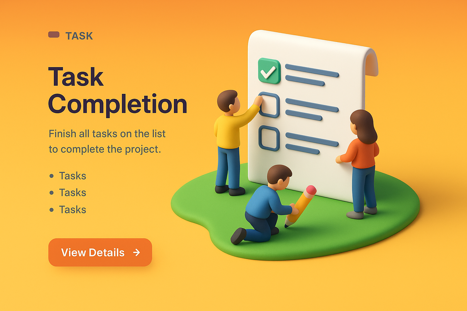 /Collection: /by davooda/Type: PNG/A colorful 3D illustration depicting miniature characters completing tasks on a checklist. The scene features a smooth gradient background and visually engaging elements.
