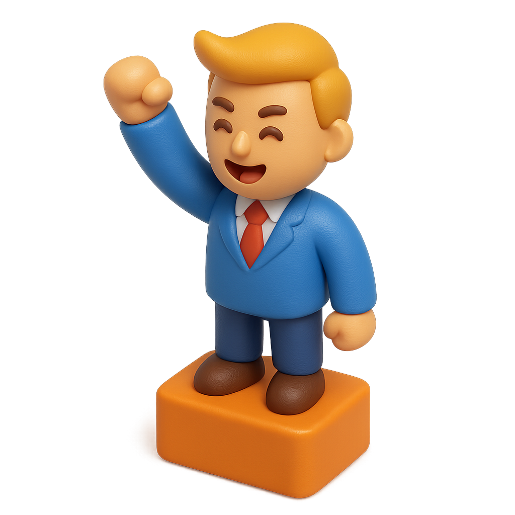 A vibrant 3D icon depicting a cheerful character with a raised fist, wearing a blue suit and orange shoes. The figure exudes a sense of pride and confidence, set against a softly lit background.