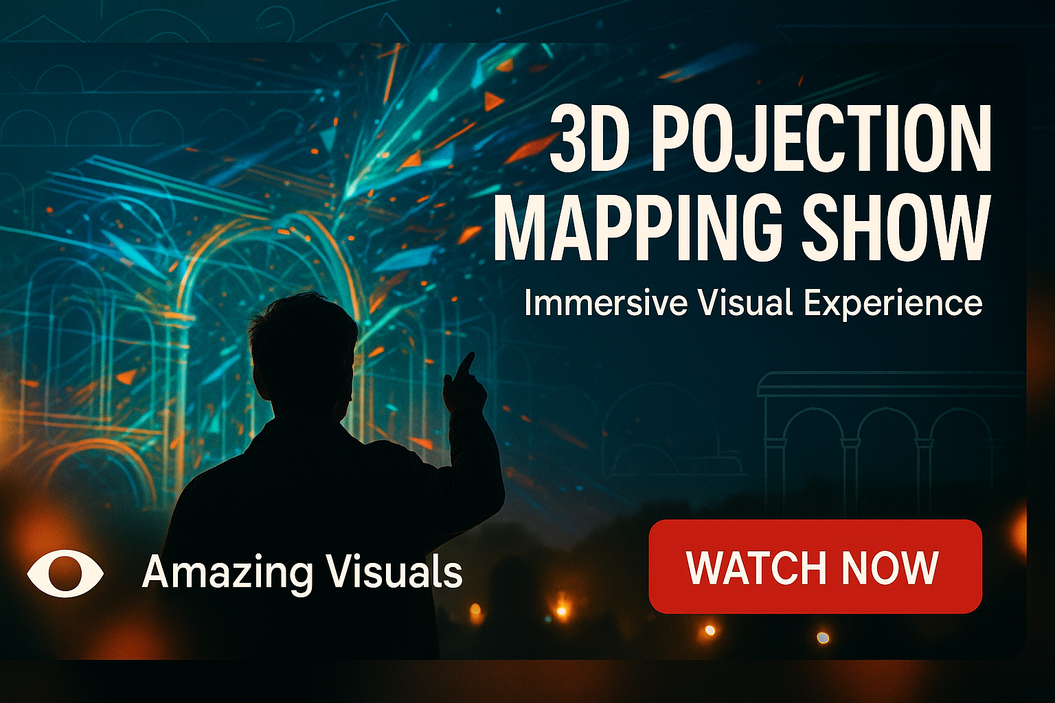 Engaging promotional banner featuring a silhouette against a vibrant 3D projection mapping backdrop, designed to attract viewers to an immersive visual experience.