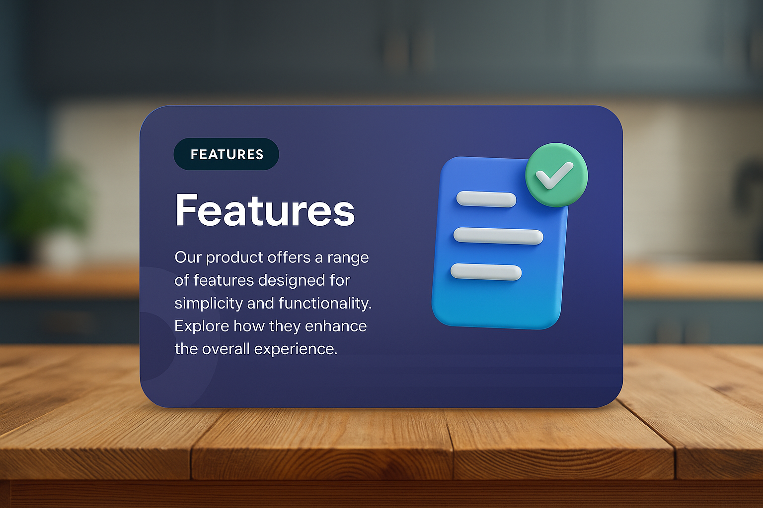/Collection: /by davooda/Type: PNG/A wooden table is set in a blurred kitchen backdrop, featuring a modern card displaying features of a product. The scene emphasizes simplicity and functionality.