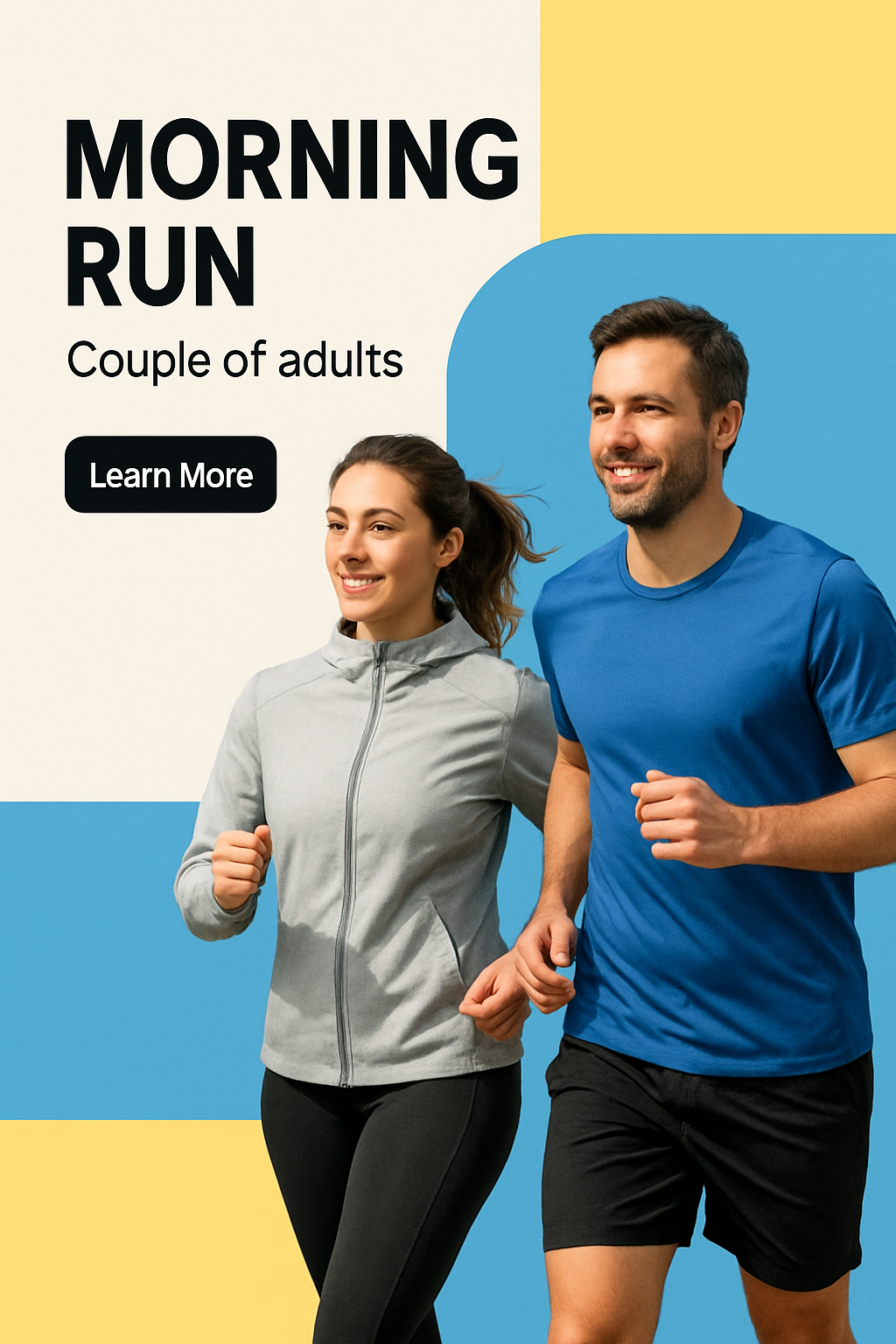 /Collection: /by davooda/Type: PNG/A vibrant image of a couple jogging together during a morning run. The background features geometric shapes and bright colors, enhancing the dynamic atmosphere. The typography is bold and clear, promoting a fresh, modern look.