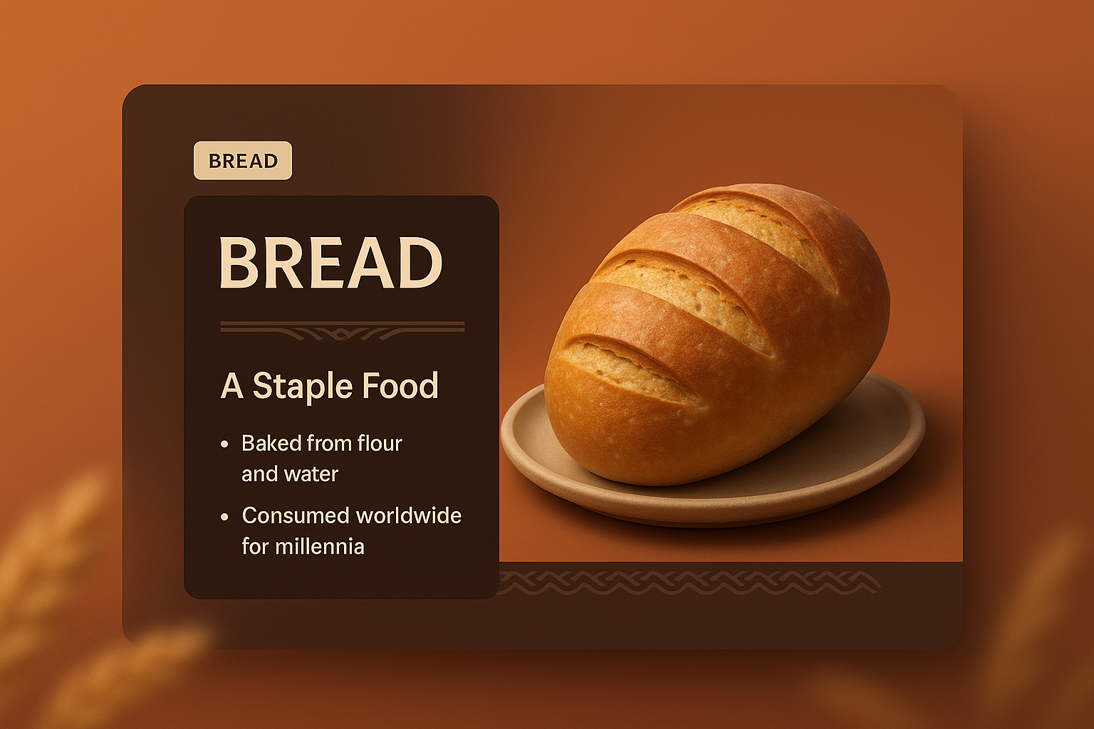 /Collection: /by davooda/Type: PNG/This image features a realistic 3D illustration of a loaf of bread on a plate, complemented by a stylish dark banner containing descriptive text. The warm color tones create a cozy atmosphere.