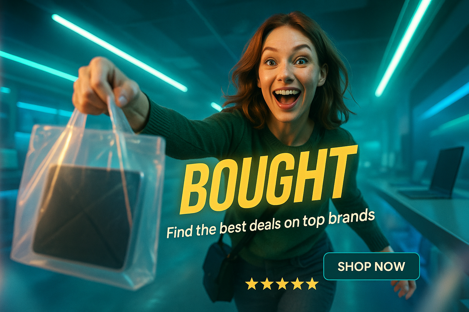 /Collection: /by davooda/Type: PNG/A vibrant and dynamic carousel slide featuring a joyful shopper holding a bag, highlighted by neon accents. The design emphasizes exciting deals with bold text and glowing elements.