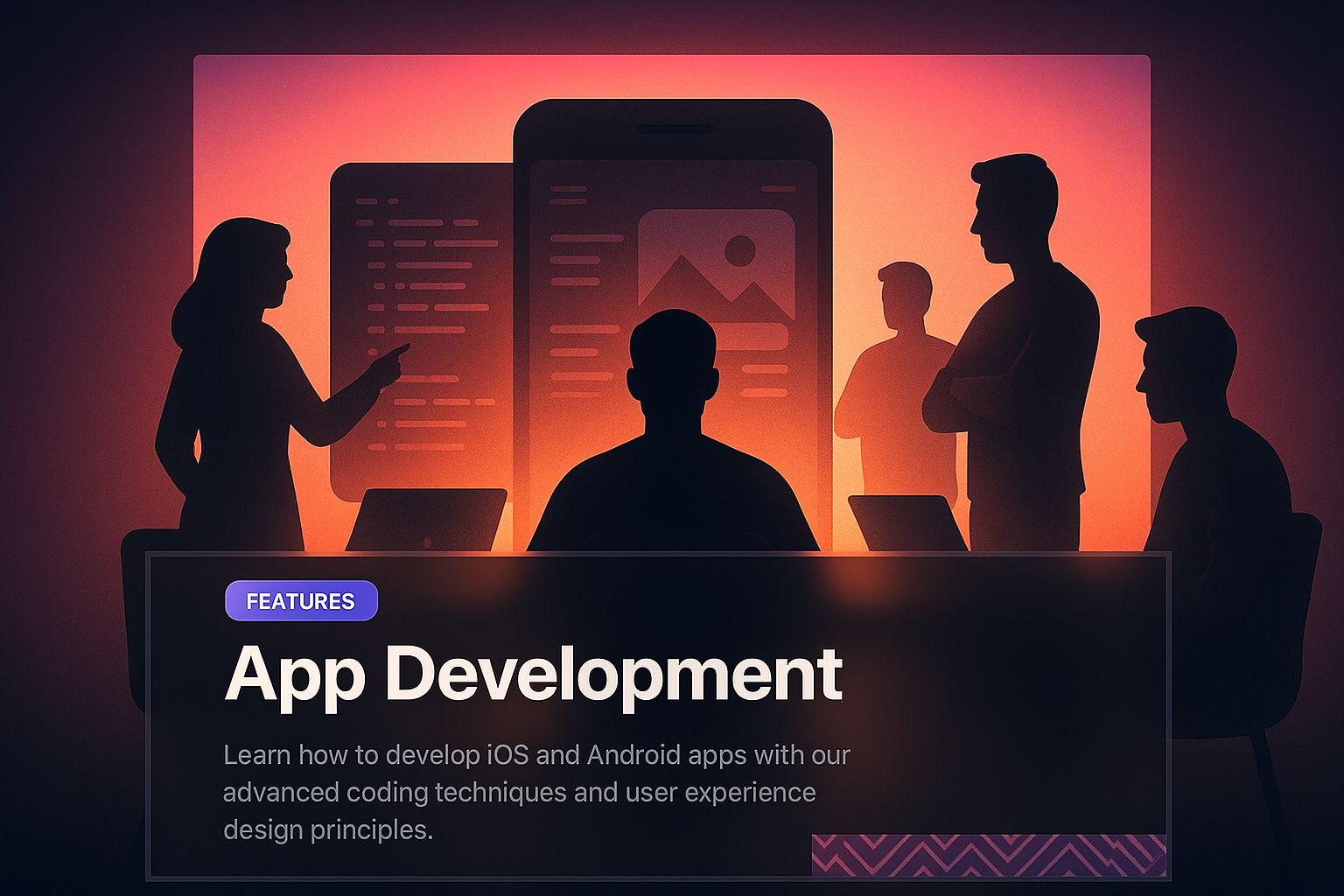 /Collection: /by davooda/Type: PNG/A silhouette of a team of developers working on mobile app development, with a vibrant gradient background. The scene highlights coding for iOS and Android platforms, emphasizing teamwork and creativity.