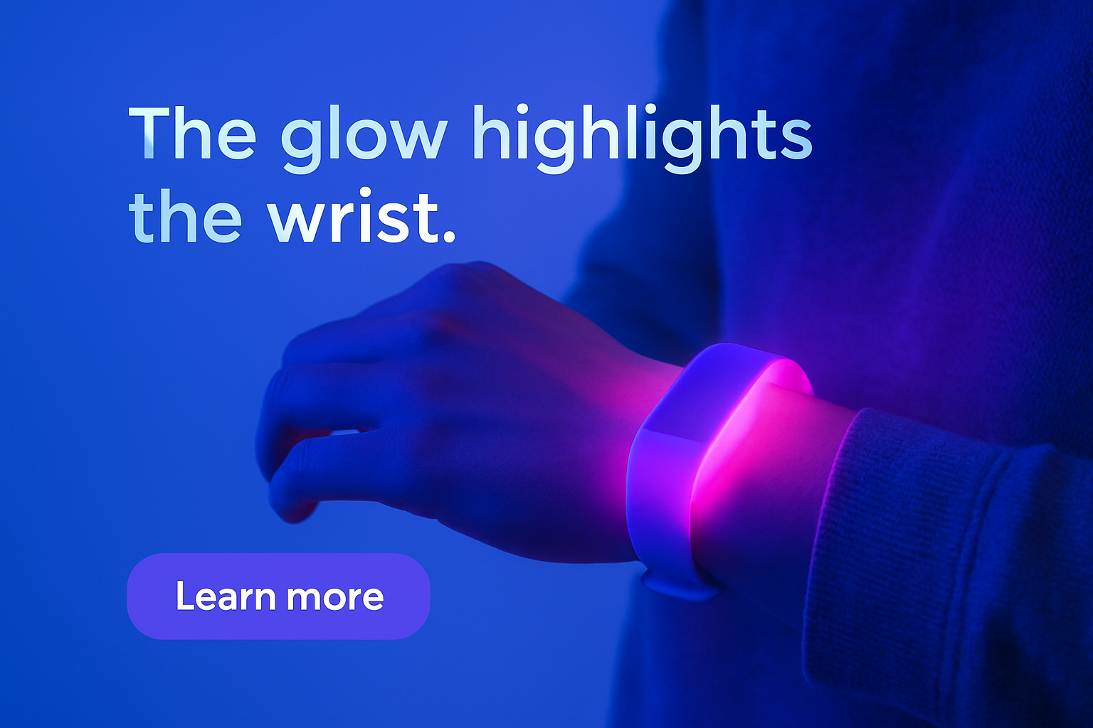 A glowing wristband emits a vibrant neon-pink light, illuminating the wrist and surrounding area against a solid blue background, creating a captivating atmosphere.