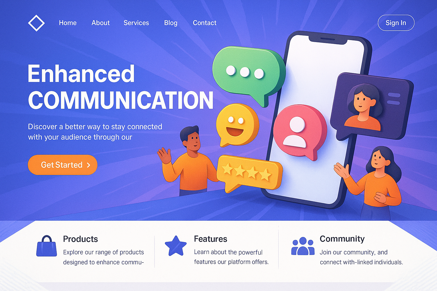 /Collection: /by davooda/Type: PNG/A vibrant landing page featuring 3D illustrations of communication concepts. Elements include chat bubbles, user icons, and action buttons, showcasing products and community features.