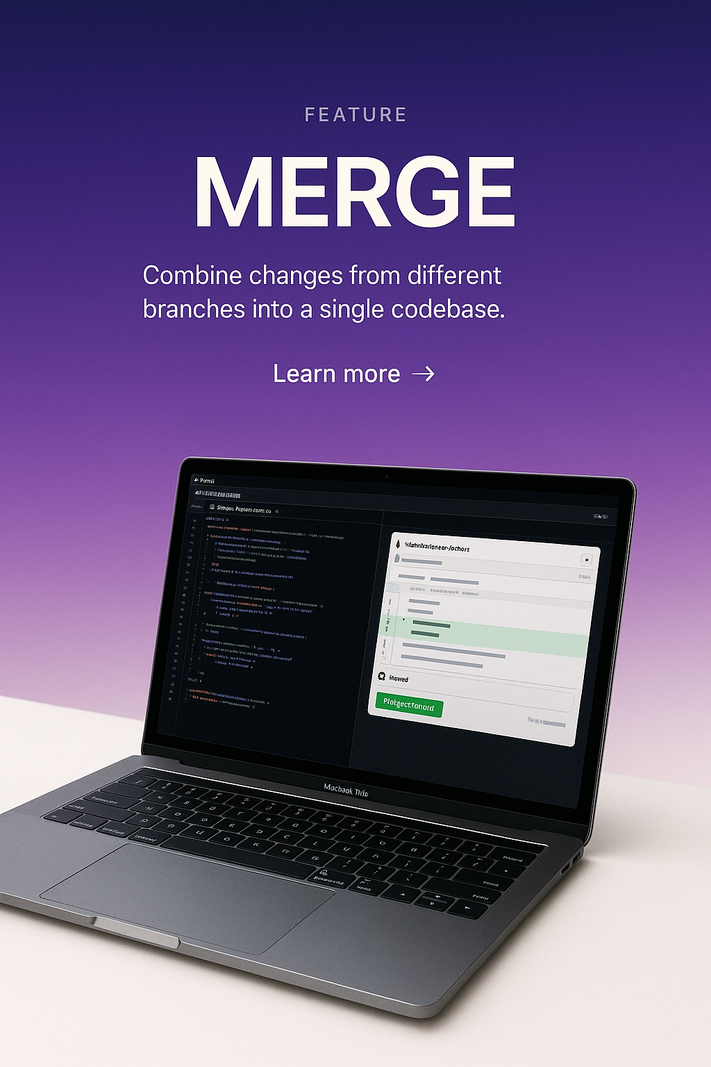 A sleek web design concept showcasing a laptop displaying coding elements with a gradient background. The focus is on the 'Merge' feature with a call-to-action button.