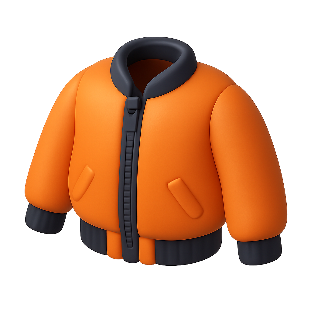 A vibrant 3D orange bomber jacket icon presented in a three-quarter isometric view, featuring a sleek design with black accents and a soft, volumetric appearance.