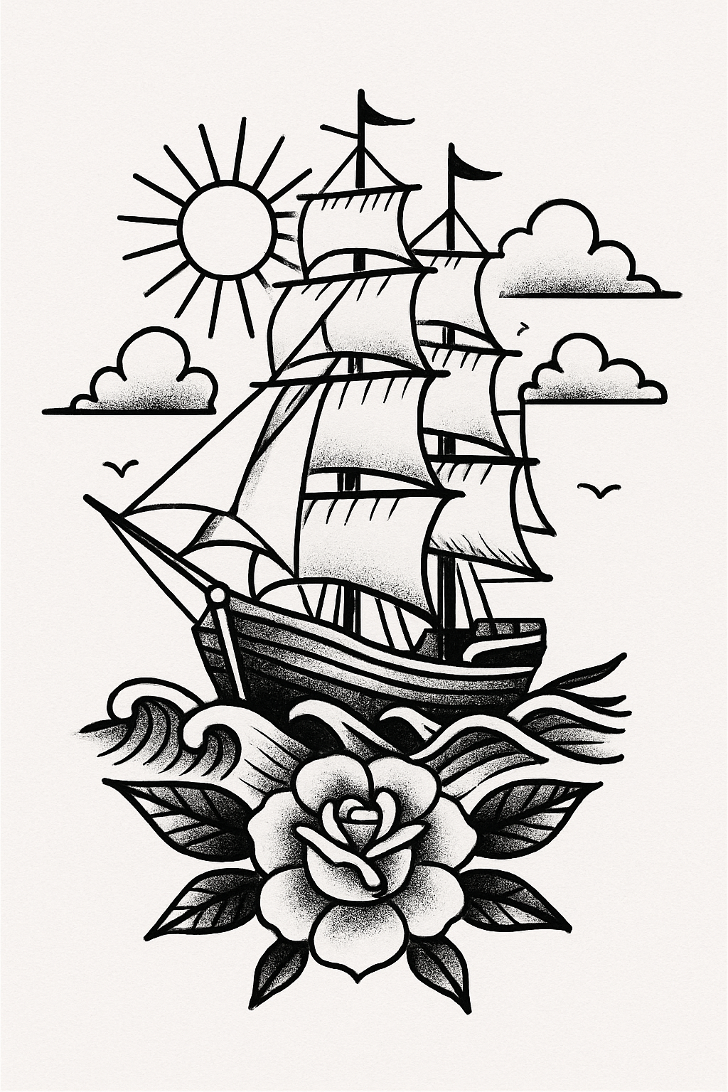 A black and white tattoo illustration depicting a sailing ship amidst waves, accompanied by a rose. Ideal for tattoo enthusiasts and design inspiration.