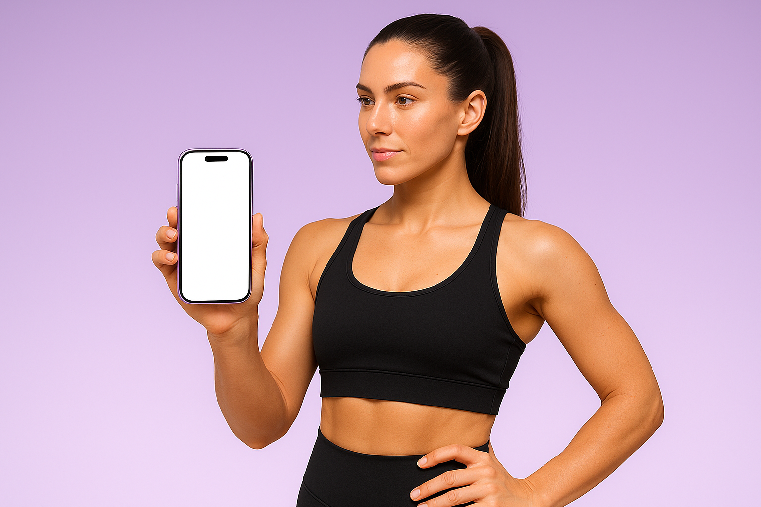 A fitness trainer in a black sports bra and leggings holds a purple smartphone with a white screen, set against a soft purple background.