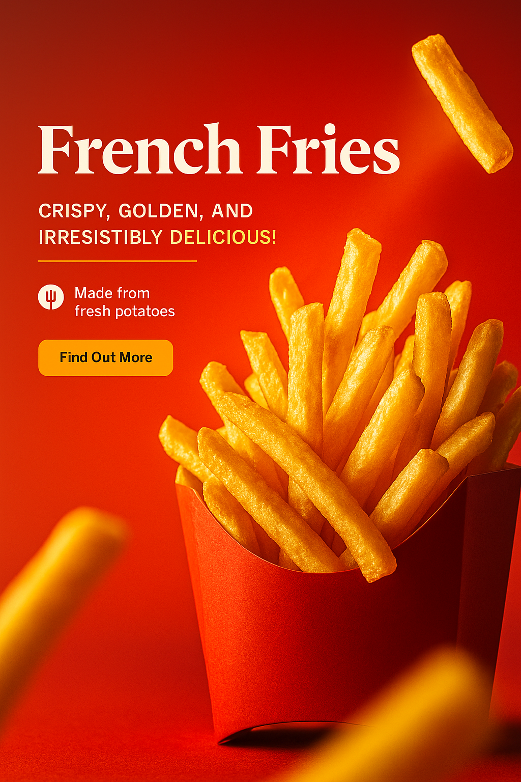 /Collection: /by davooda/Type: PNG/A striking composition featuring a box of crispy, golden French fries against a bright red background. The fries are highlighted with a dynamic angle and backlighting, enhancing their appeal.