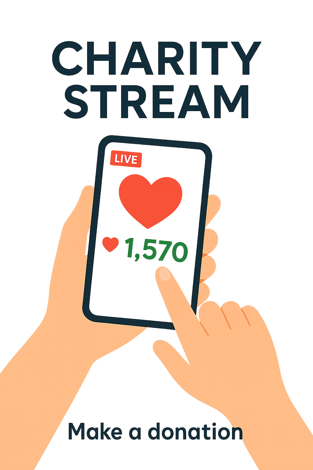 Engaging charity stream promotional image featuring a mobile device displaying live donation statistics, ideal for social media and fundraising campaigns.