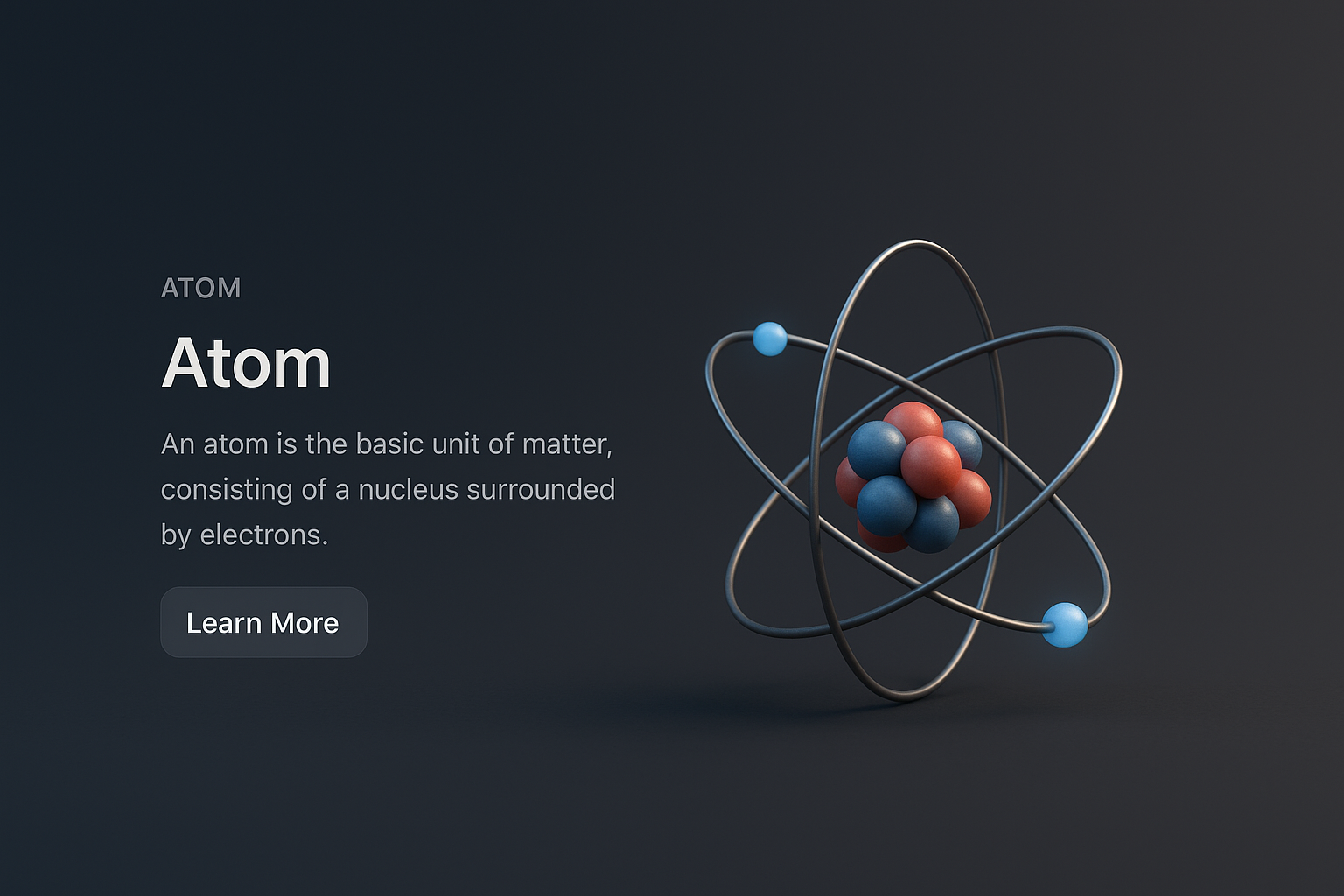 /Collection: /by davooda/Type: PNG/A detailed 3D representation of an atom, with a dark gradient background. It features a nucleus surrounded by electrons, accompanied by informative text and a call-to-action button.