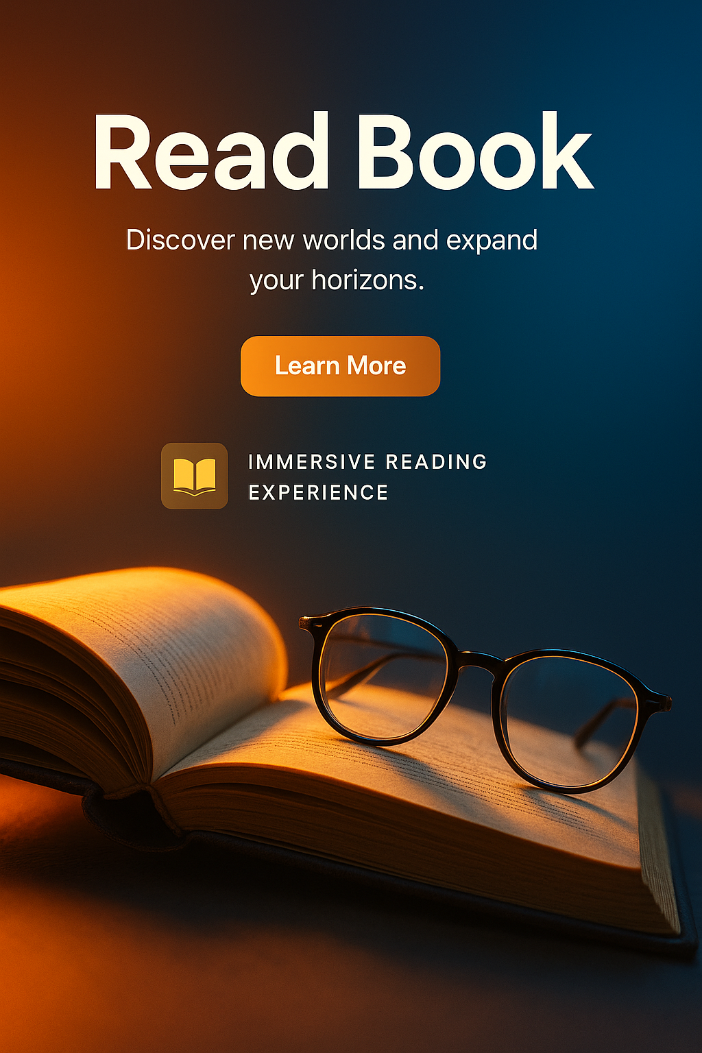 /Collection: /by davooda/Type: PNG/This is a social media post promoting an immersive reading experience. It features an open book and glasses with a modern, engaging design suitable for book enthusiasts.
