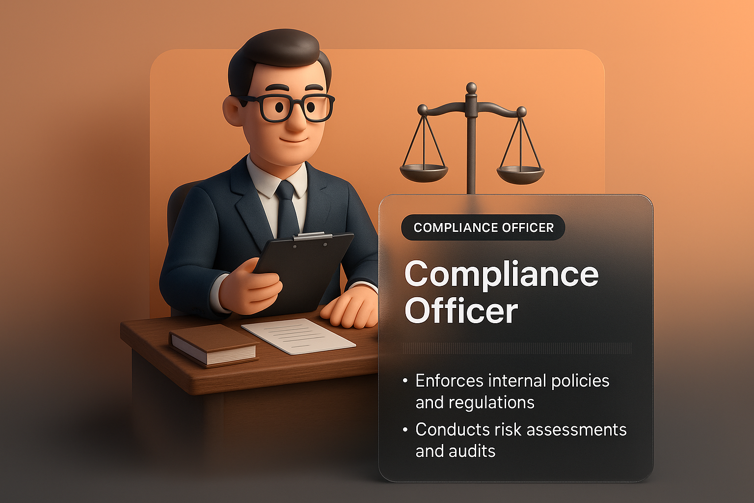 /Collection: /by davooda/Type: PNG/A 3D illustration of a Compliance Officer seated at a desk, holding a clipboard. The image features a scale of justice, with transparent layered effects and a dark panel for text highlighting key responsibilities.