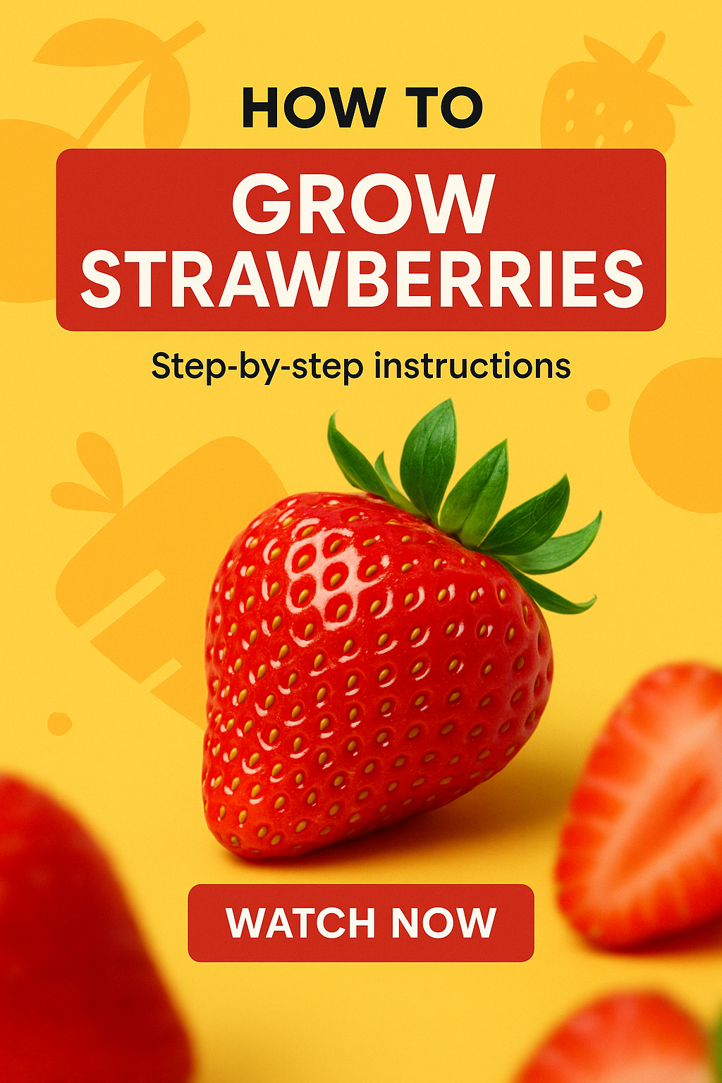 /Collection: /by davooda/Type: PNG/Informative social media post featuring a bright yellow background with a prominent strawberry and clear instructions on growing strawberries. Ideal for gardening enthusiasts.