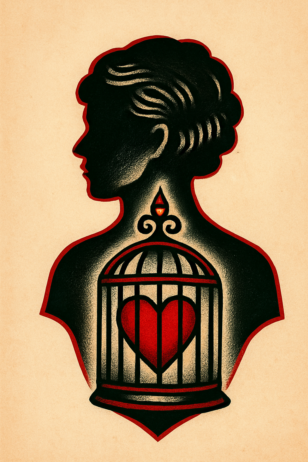 A classic tattoo sketch featuring a silhouette of a person with a heart enclosed in a decorative cage. The design uses multiple colors against a light beige background.