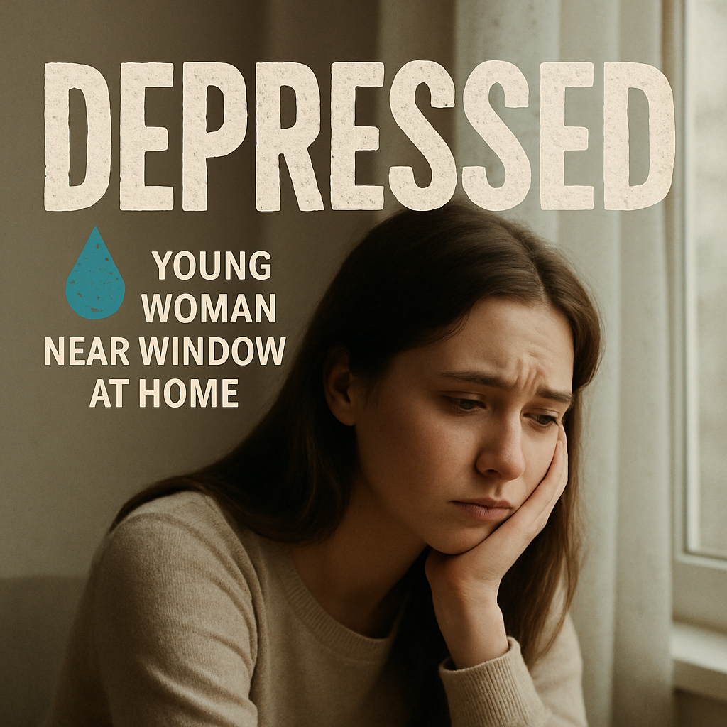 /Collection: /by davooda/Type: PNG/A poignant image capturing a young woman looking contemplative and sad by a window, conveying themes of introspection and emotional struggle, ideal for mental health awareness.
