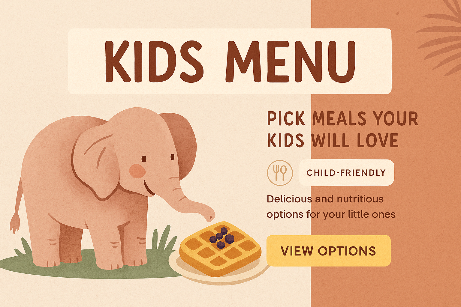 /Collection: /by davooda/Type: PNG/A whimsical kids menu featuring an adorable elephant and delicious meal options. The design combines playful elements with a soft color palette, creating a charming and inviting atmosphere.
