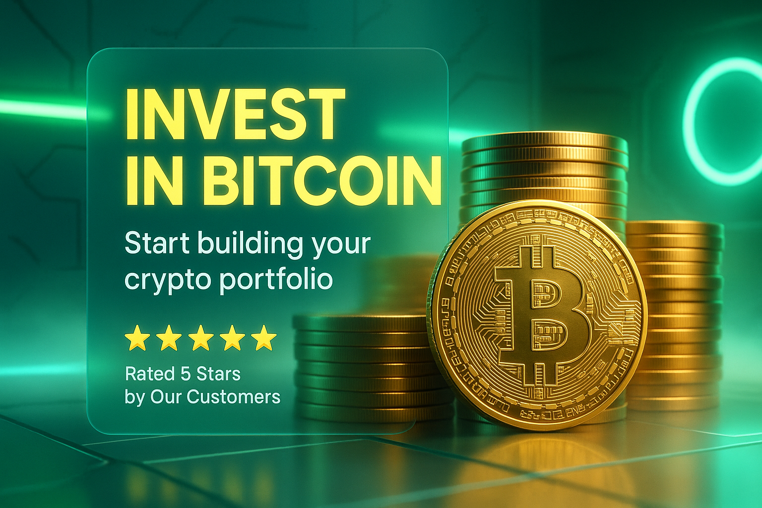 Vibrant promotional graphic emphasizing Bitcoin investment, featuring stacks of coins and glowing elements, ideal for financial marketing campaigns.