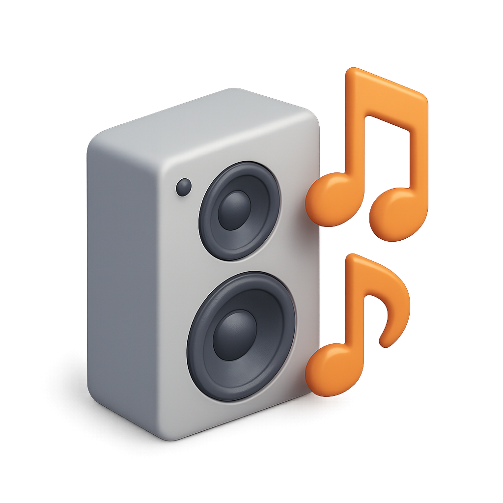 This image features a sleek 3D speaker design accompanied by vibrant musical notes, showcasing an isometric view and a modern aesthetic.