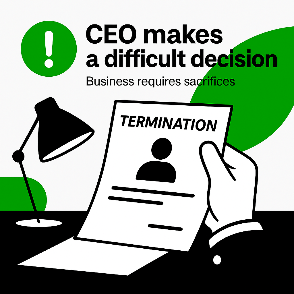 /Collection: /by davooda/Type: PNG/Stylized graphic illustrating a CEO's difficult decision on employee termination, featuring a hand holding a termination notice. Ideal for corporate presentations or HR communications.