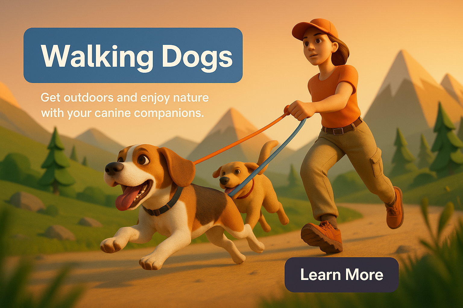 Engaging illustration showcasing a person walking two dogs in a scenic outdoor environment. Ideal for promoting dog walking services or outdoor activities.