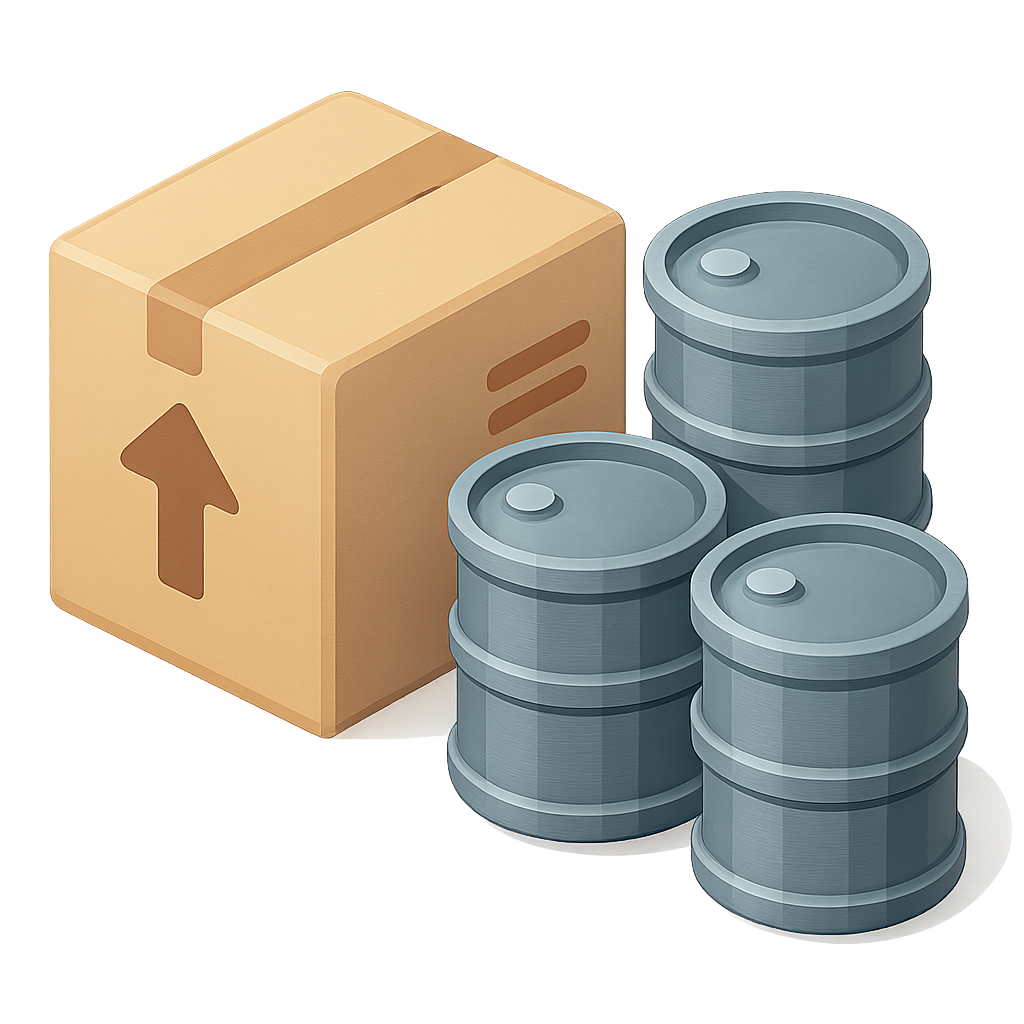 An isometric 3D icon featuring a cardboard box alongside three metallic barrels. The design emphasizes volume and depth with a transparent background.