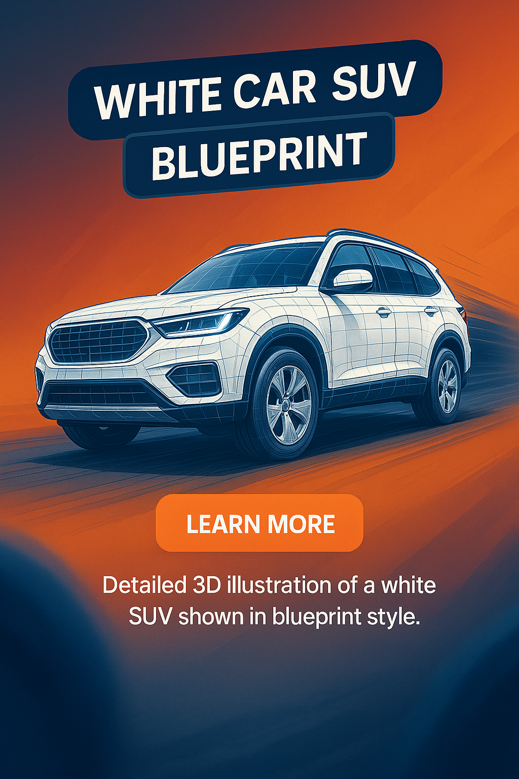 This image features a detailed 3D illustration of a white SUV depicted in a blueprint style, suitable for automotive design showcases or educational purposes.