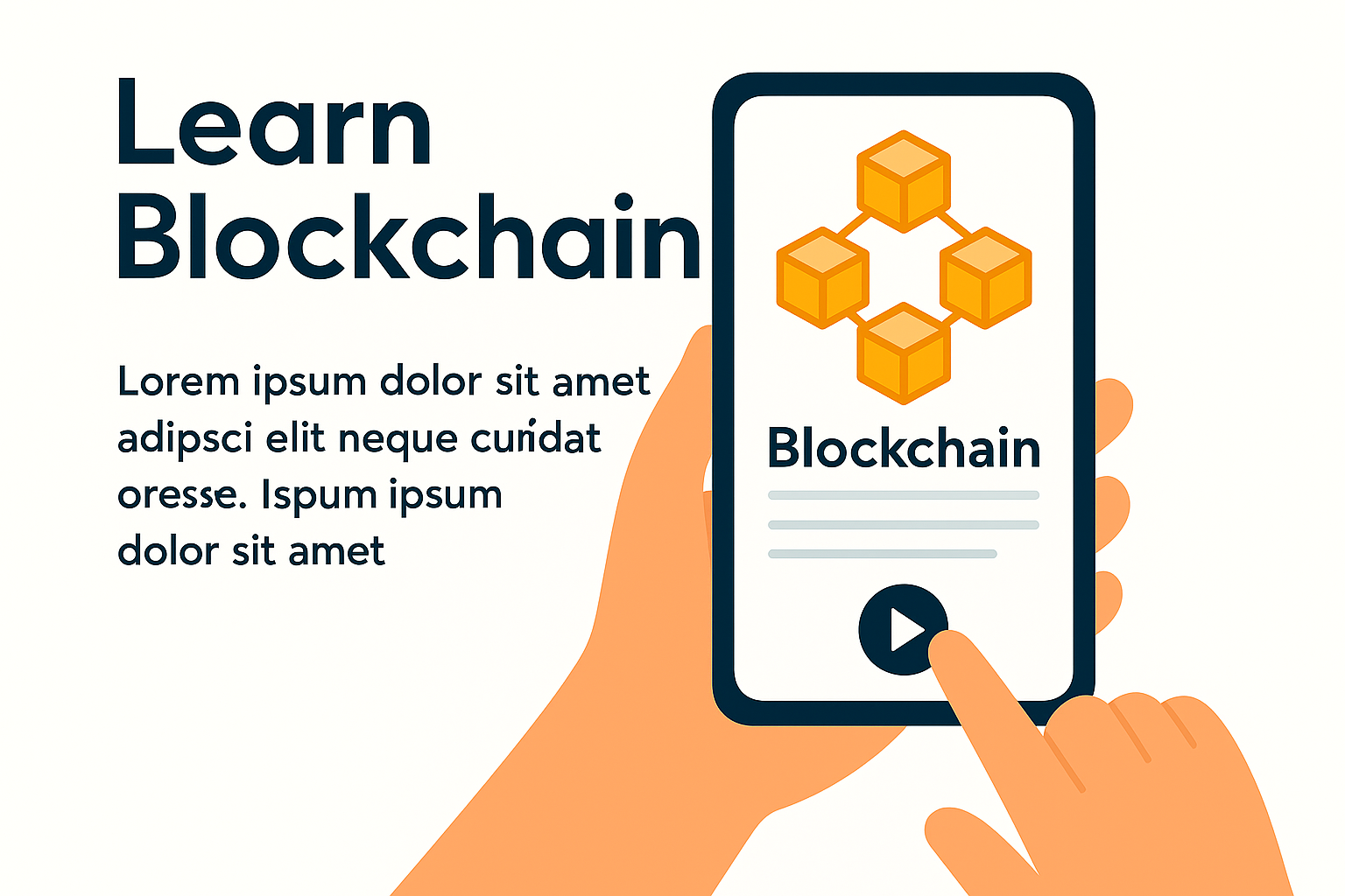 Illustration of a mobile device showcasing a blockchain learning app with engaging visuals, designed for educational purposes and tech-savvy audiences.