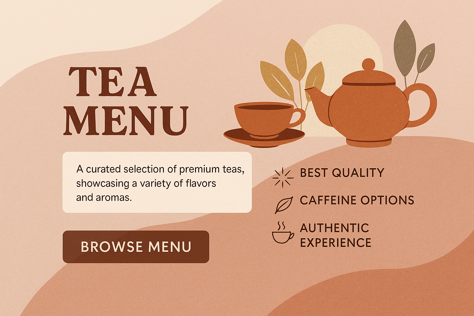 /Collection: /by davooda/Type: PNG/A visually appealing tea menu template in a boho style, featuring a warm color palette, a teapot, and a cup of tea. The layout includes engaging text and icons to highlight key features.