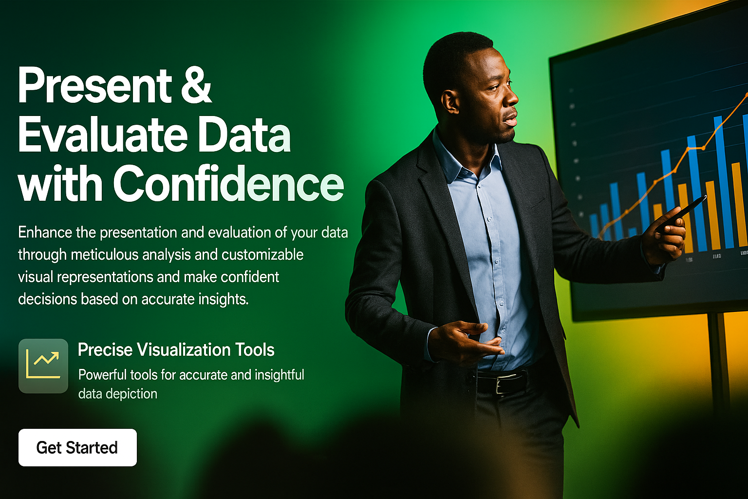 /Collection: /by davooda/Type: PNG/A professional individual presents and evaluates data charts confidently. The background features a vibrant gradient, enhancing the visual appeal. Engaging text highlights the importance of precise visualization tools.