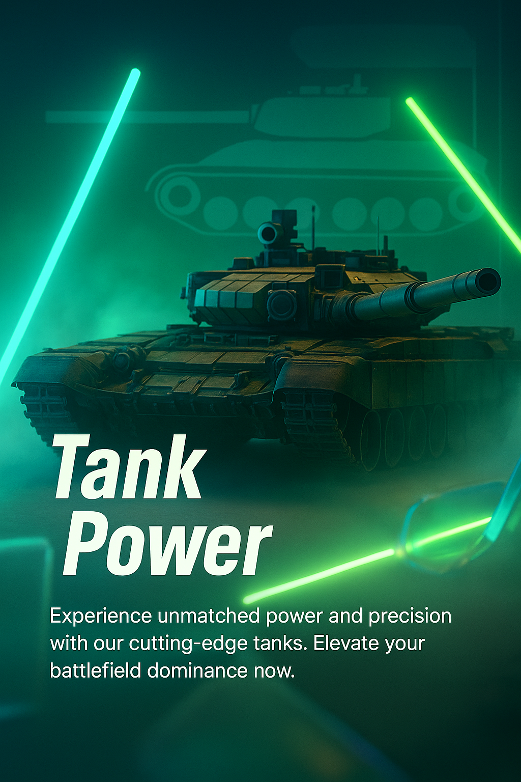 A visually striking advertisement featuring a tank with neon accents and glowing elements. The design emphasizes power and precision with engaging text overlays.