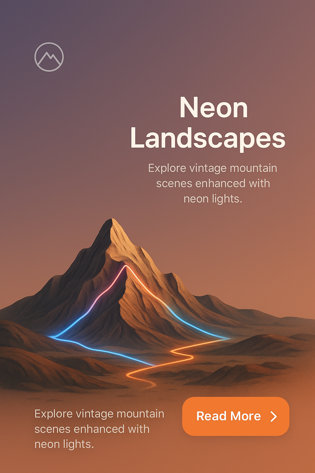 An abstract vintage mountain landscape illuminated by neon lights, showcasing a zoomed-out perspective. The scene captures a serene environment with a smooth gradient background.