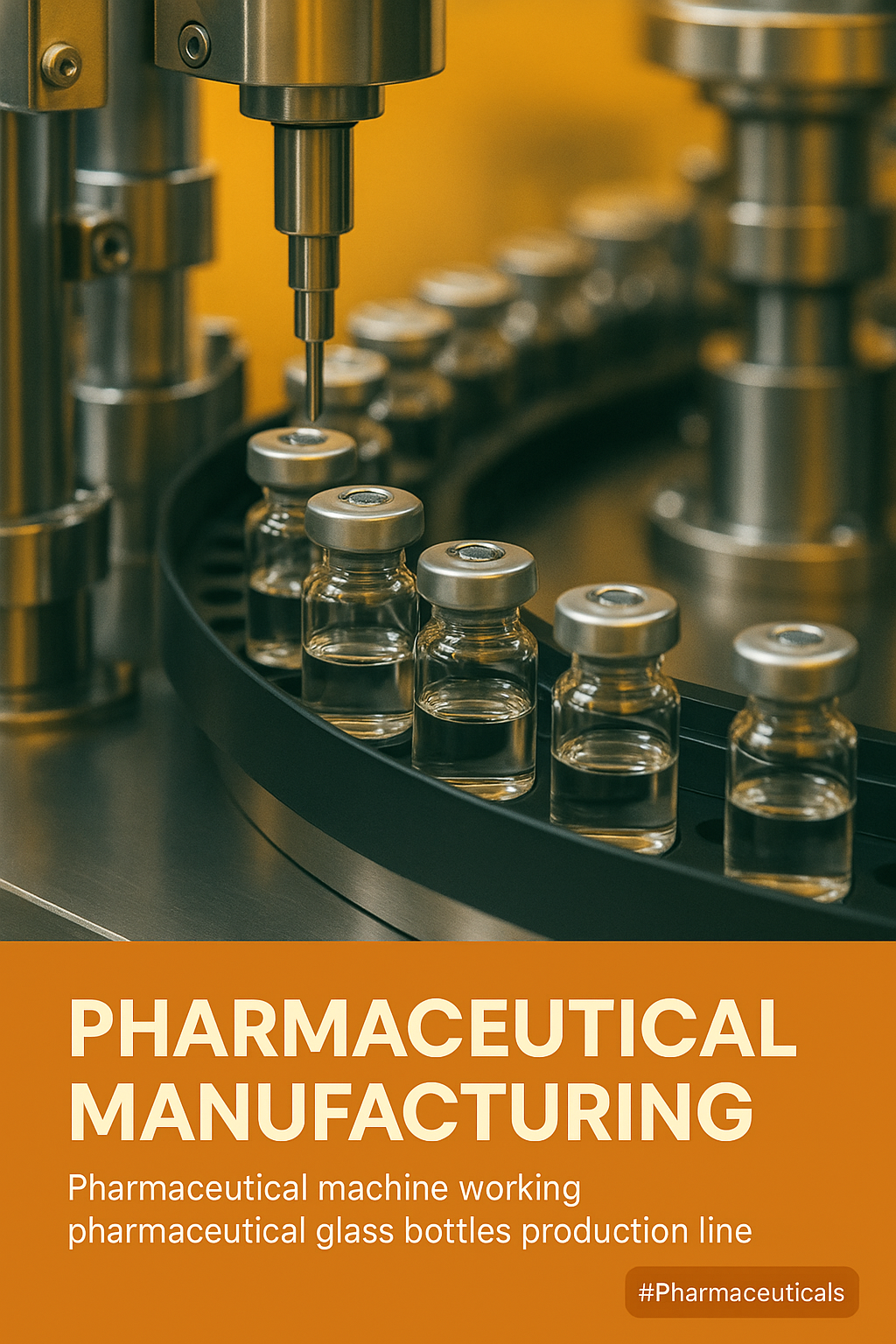 /Collection: /by davooda/Type: PNG/Detailed image of a pharmaceutical manufacturing process showcasing glass vials on a production line, ideal for industry-related content or educational materials.
