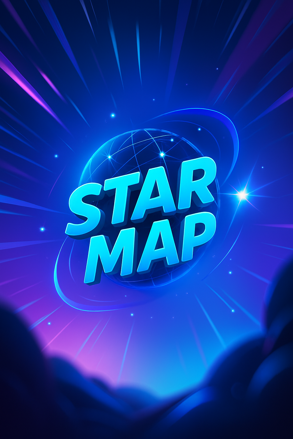 /Collection: /by davooda/Type: PNG/A vibrant star map illustration featuring a bold title 'STAR MAP' with dynamic rays emanating from a central globe. The background transitions smoothly with rich colors, creating an engaging and professional aesthetic.