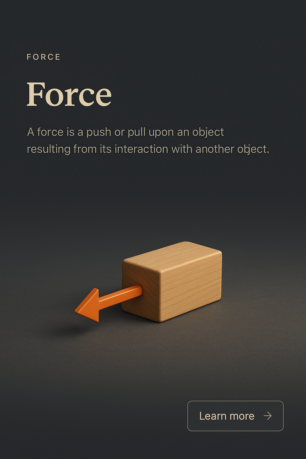 /Collection: /by davooda/Type: PNG/A minimalist 3D scene illustrating the concept of force, featuring a wooden block with an orange arrow. The dark gradient background enhances the realism and focus on the object.