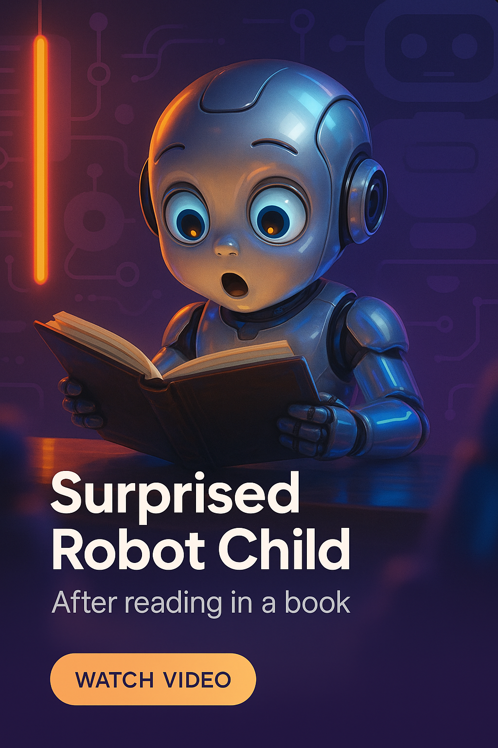 /Collection: /by davooda/Type: PNG/An animated graphic featuring a surprised robot child reading a book, designed for video promotion. The modern and colorful style appeals to tech-savvy audiences.
