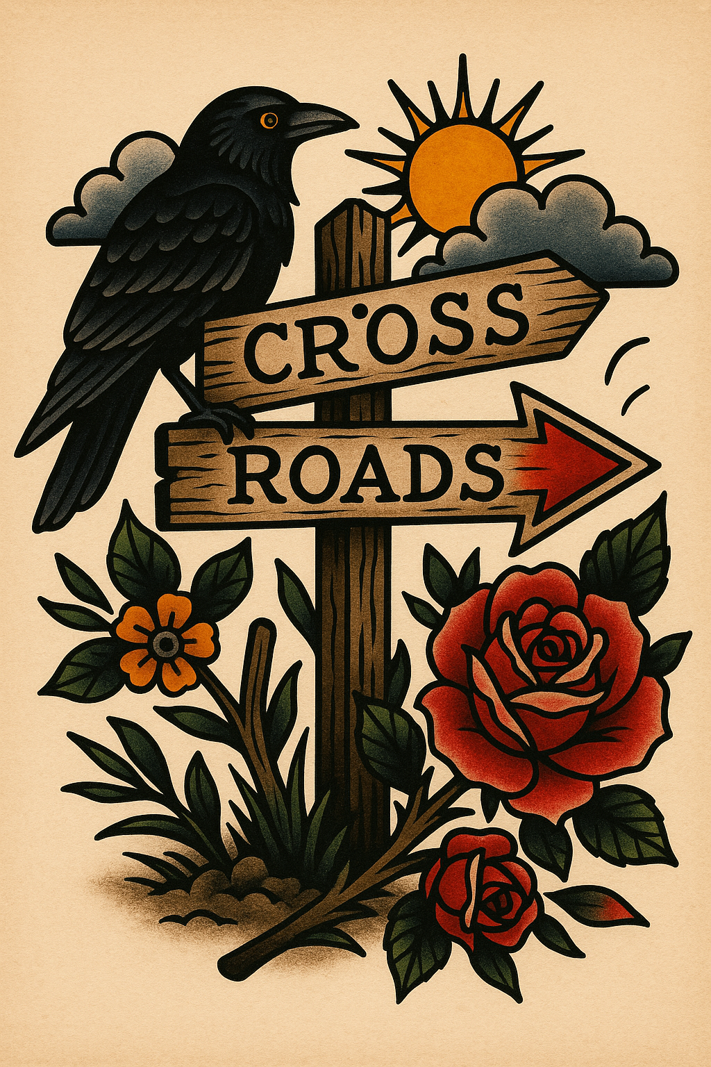 /Collection: /by davooda/Type: PNG/This image features a vintage-style crossroads sign with a crow, roses, and a sun. It combines illustrative and nature elements, suitable for art prints or tattoos.
