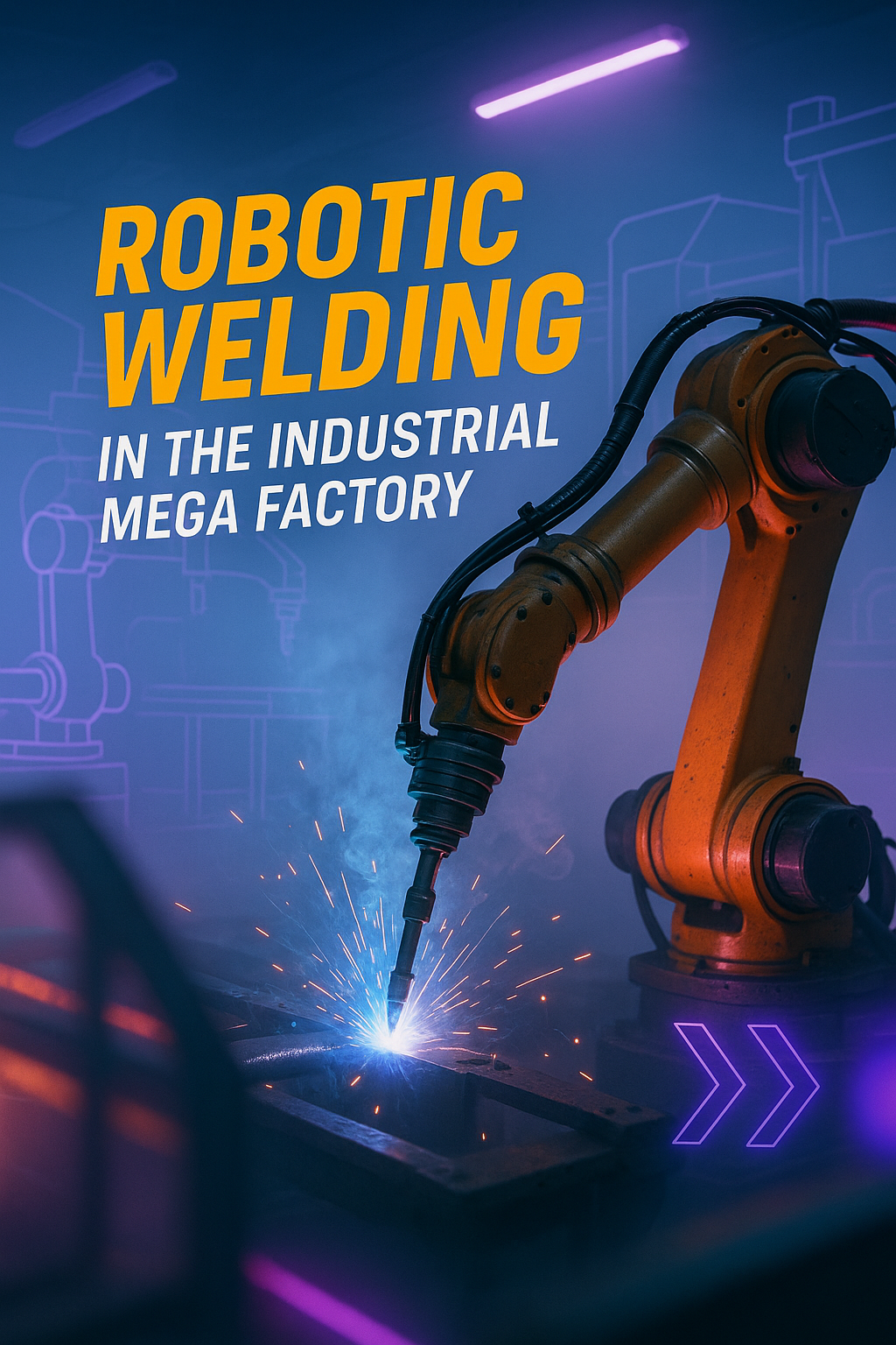 Robotic Welding in an Industrial Mega Factory with Futuristic Aesthetics