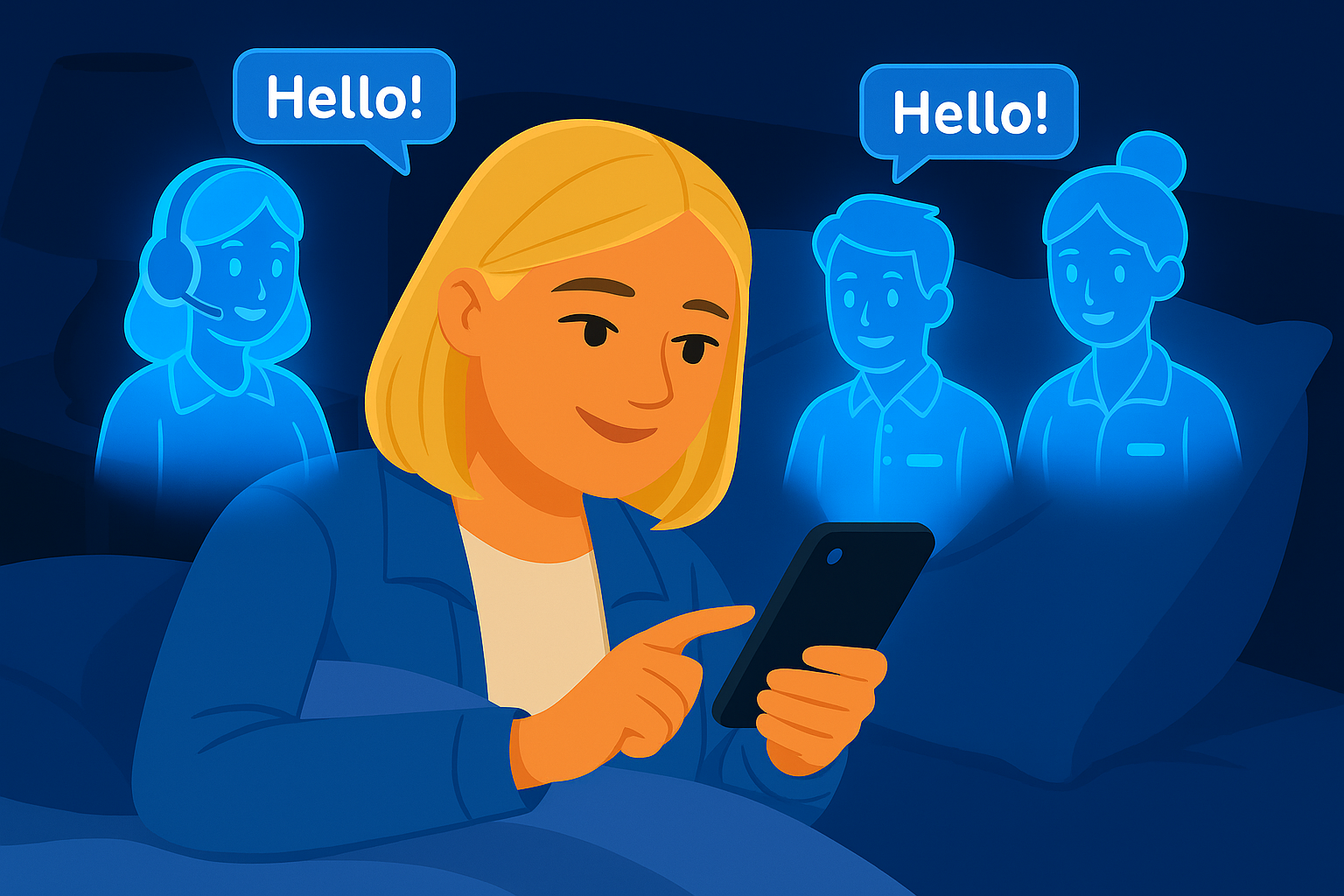 Illustrative graphic depicting a person using a smartphone in bed, engaged in digital communication with ghost-like figures. Ideal for topics on technology and social interaction.