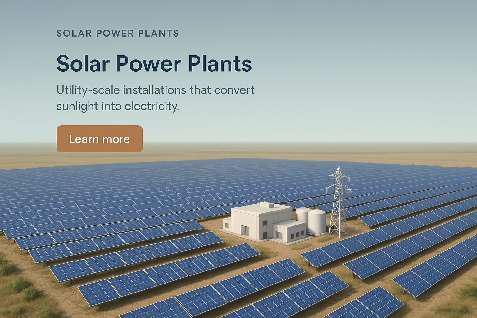 /Collection: /by davooda/Type: PNG/A detailed 3D representation of solar power plants from an aerial perspective, showcasing vast fields of solar panels and supporting infrastructure under a clear sky.